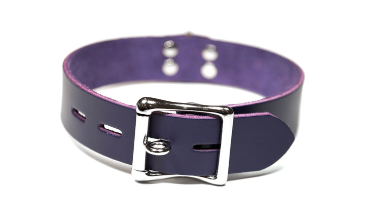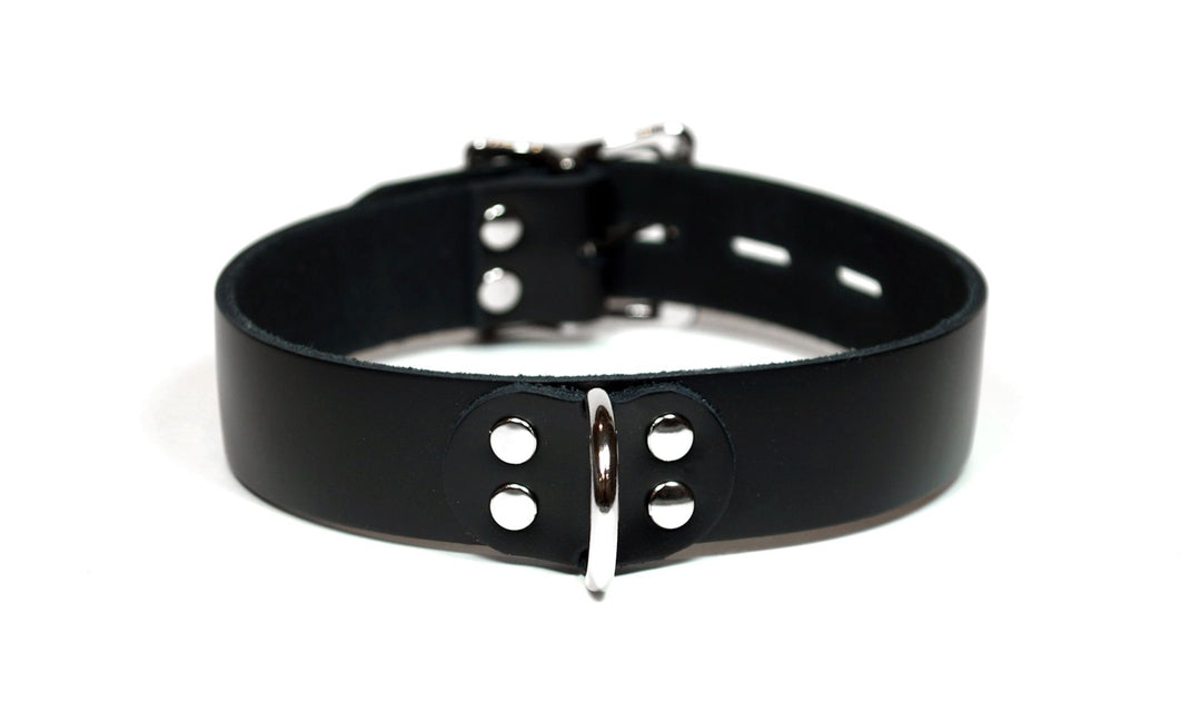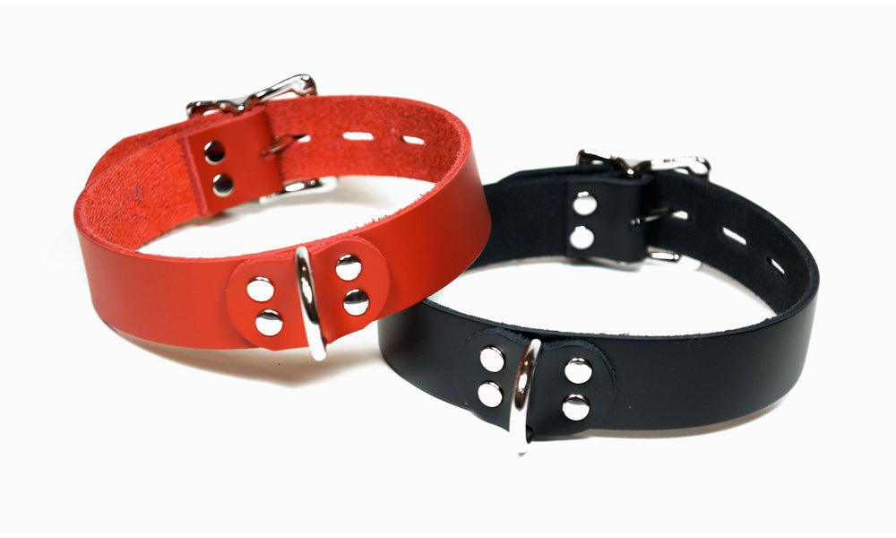 This handmade leather bondage collar is 1 inch wide and made with premium dyed latigo leather. The front of this collar features a Dee Ring secured by a leather centre and nickle plated rivets. The back buckle has a "locking tongue" which means it can be used just like a standard buckle, or a small lock can be added if desired. Made to be both durable and comfortable to wear, this collar is well suited for any level of play.