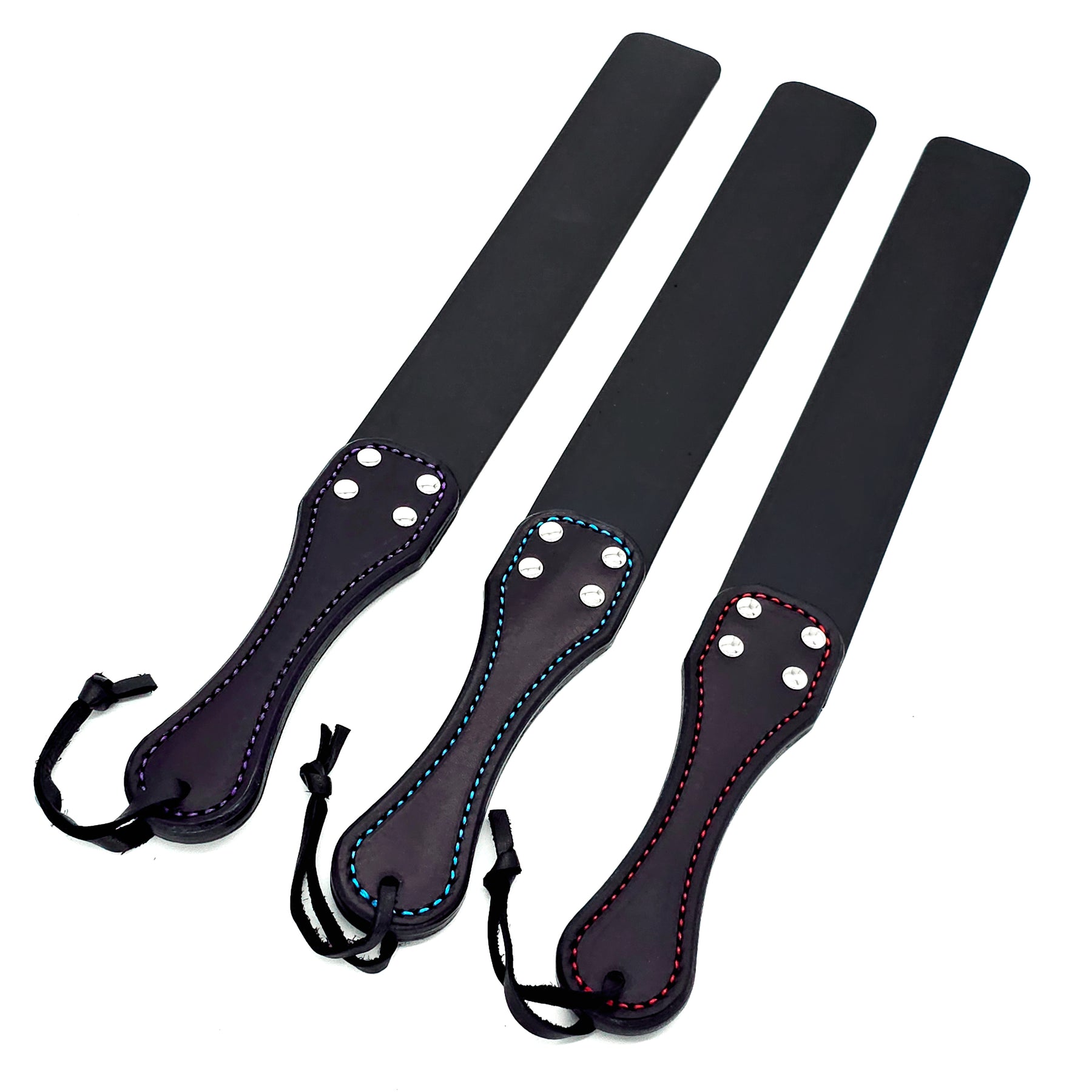 A must-have for those looking to add some spice to their impact toy arsenal! Each of our Rubber Strap feature a hand-crafted leather grip, nickel-plated rivets, and an impressive 2" wide PVC rubber-coated nylon slapper, delivering a satisfying impact that will leave you wanting more!